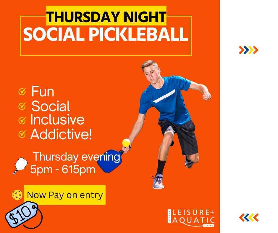 ALAC is offering an evening session of Pickleball. We will now just do pay on entry, no need to book, pay $10 at the front counter and bring your receipt down to the courts. We're moving the time to Thursday's from 5pm - 615pm starting 9th October.