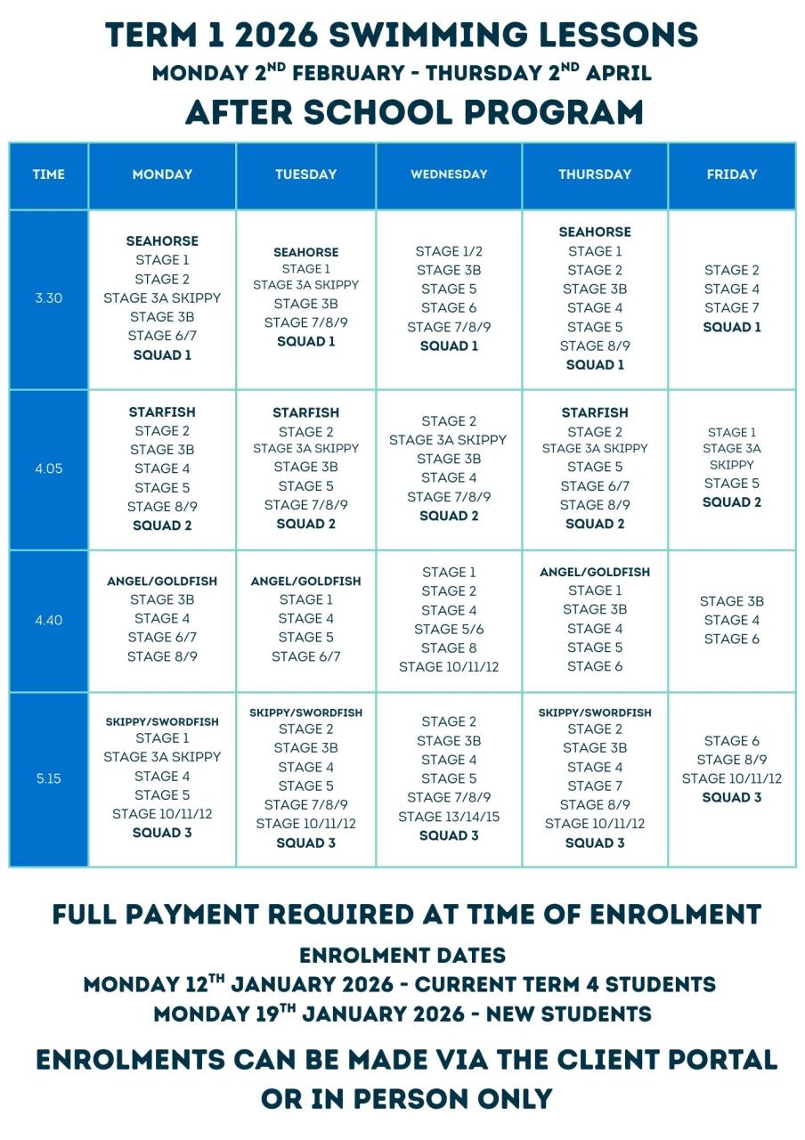 Endurance Squads - For students who have passed stage 6. This is the first level of squads and doesn’t require a minimum time to be in this level. Students will be moved to Squads 1 when their freestyle, backstroke and breaststroke for 50 metres meet the minimum requirements.