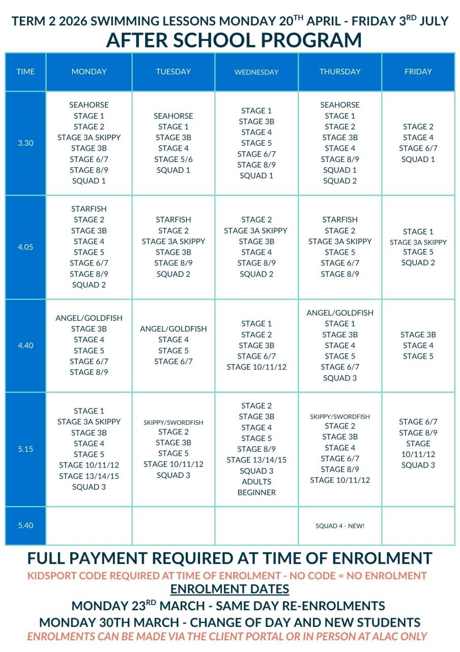 Squads has 4 levels and will be graded by the time of their freestyle, backstroke and breaststroke. This reduces the congestion in the lanes and decreases the chance on collision injuries to students.