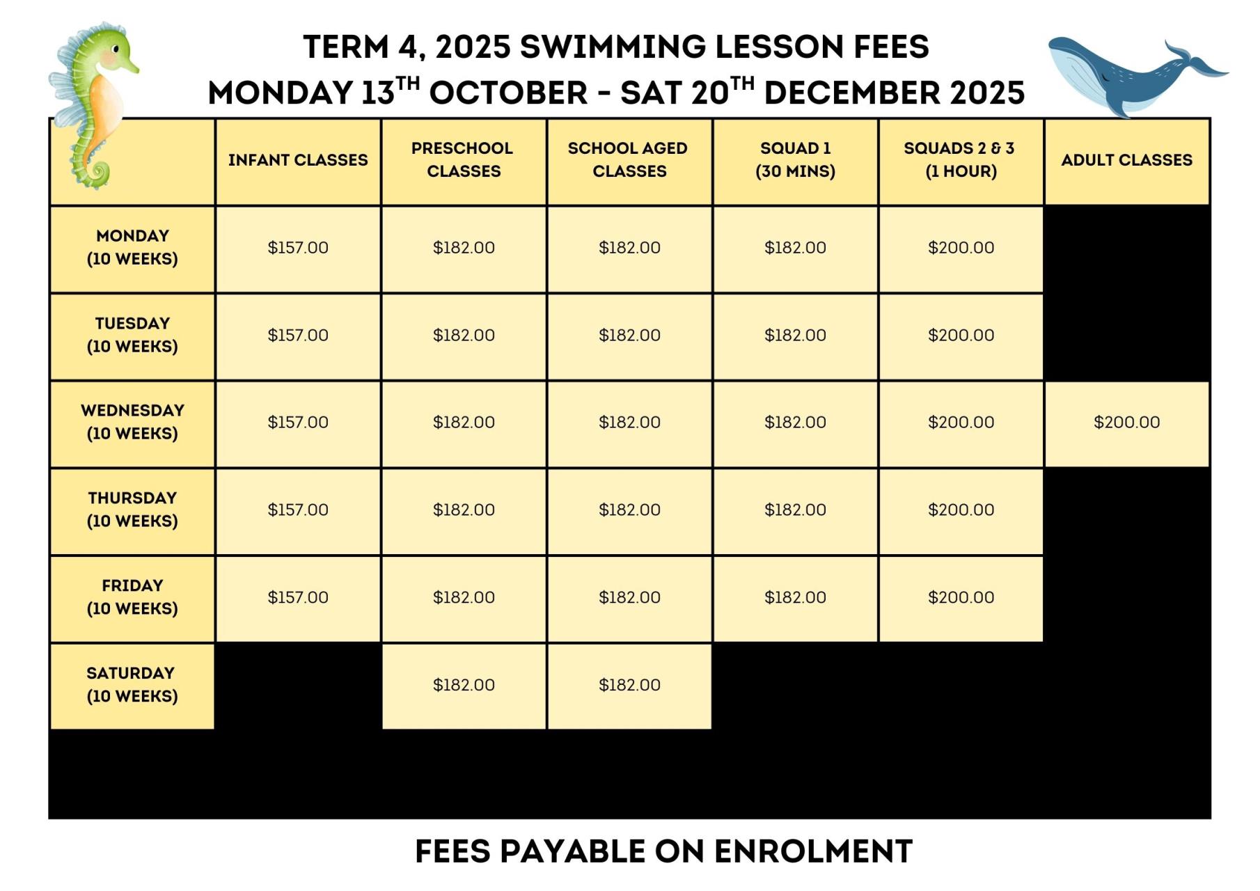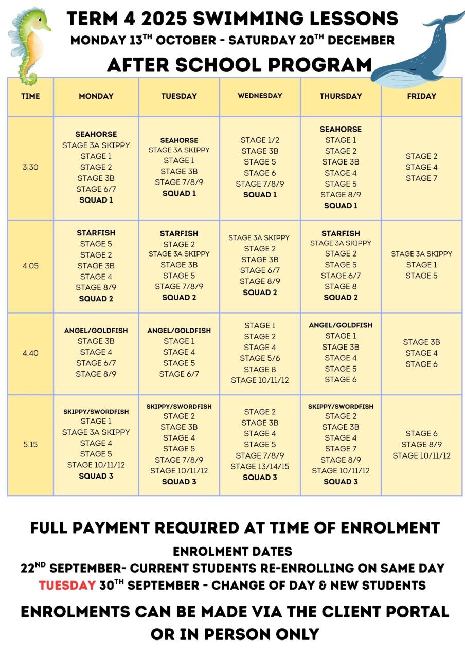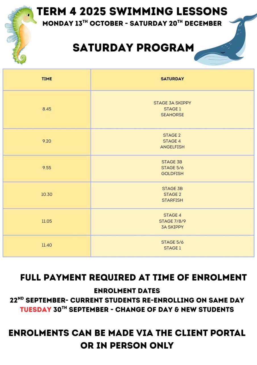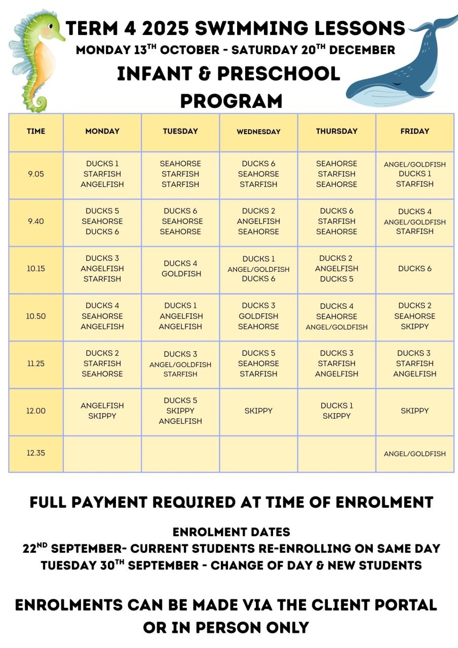 Enrolments can be made in person or via the Client Portal without needing to complete an enrolment form if previously enrolled with Swim School.